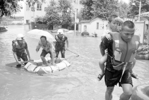 7月14日,四川省瀘州市的消防官兵在龍馬潭區(qū)救援受災(zāi)群眾。當(dāng)日,四川省瀘州市遭暴雨襲擊,部分路段內(nèi)澇嚴(yán)重,交通中斷。據(jù)瀘州市氣象局統(tǒng)計(jì),截至12時(shí),該市最大降雨量超過(guò)200毫米。 新華社發(fā)
